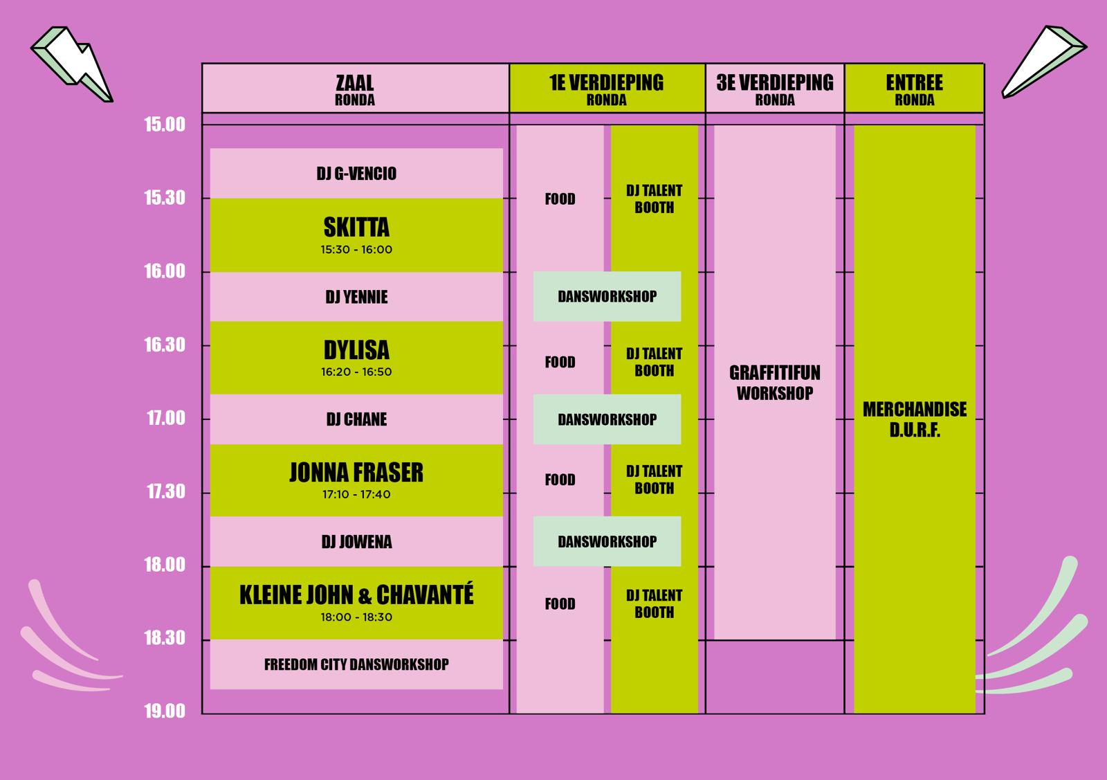 D.U.R.F. komt terug – en deze keer naar Utrecht! Op zaterdag 21 februari verandert onze Ronda in een hiphopfestival voor jong en oud. Verwacht optredens van de leukste Nederlandse hiphopartiesten: zo zie je onder andere Jonna Fraser, Kleine John & Chavanté en Dylisa. Maar er is meer! Dans mee tijdens een hiphopworkshop van Freedom City of ontwerp je eigen tag of naam onder begeleiding van echte lokale Utrechtse graffitiartiesten!